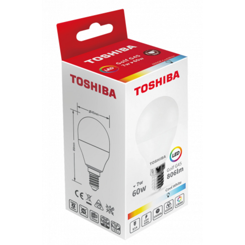 LED lámpa , égő , kisgömb , E14 foglalat , 7 Watt , 180° , hideg fehér , TOSHIBA , 5 év garancia