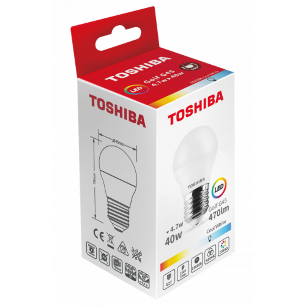 LED lámpa , égő , kisgömb , E27 foglalat , 4.7 Watt , 180° , hideg fehér , TOSHIBA , 5 év garancia