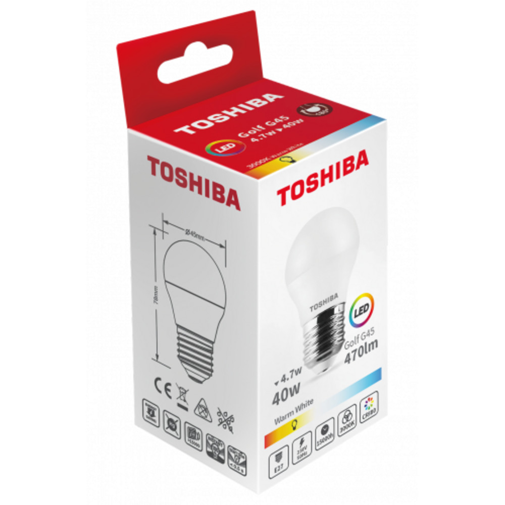 LED lámpa , égő , kisgömb , E27 foglalat , 4.7 Watt , 180° , meleg fehér , TOSHIBA , 5 év garancia