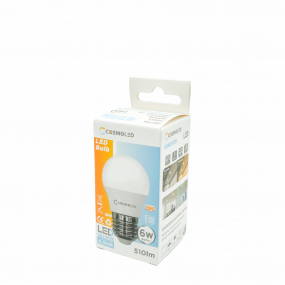 LED lámpa , égő , kisgömb , E27 foglalat , 6W , hideg fehér , COSMOLED