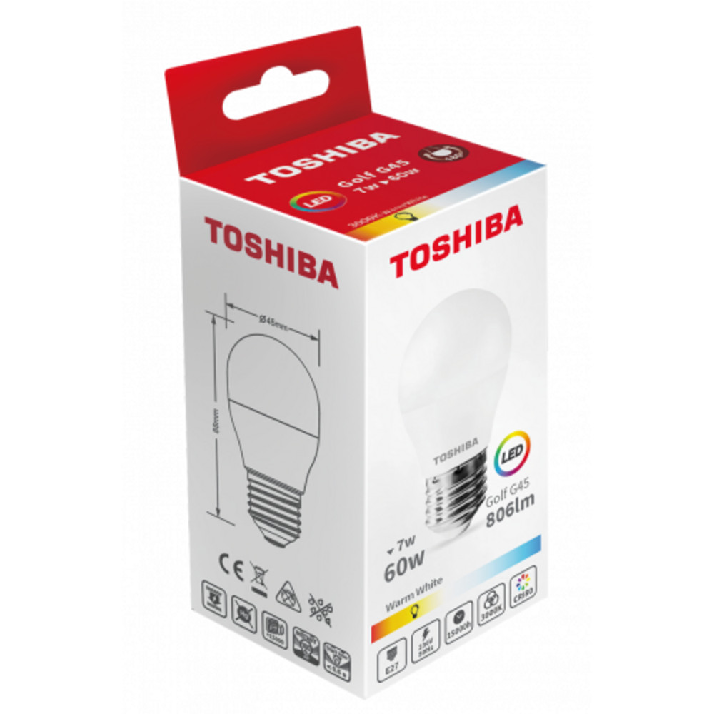 LED lámpa , égő , kisgömb , E27 foglalat , 7 Watt , 180° , meleg fehér , TOSHIBA , 5 év garancia
