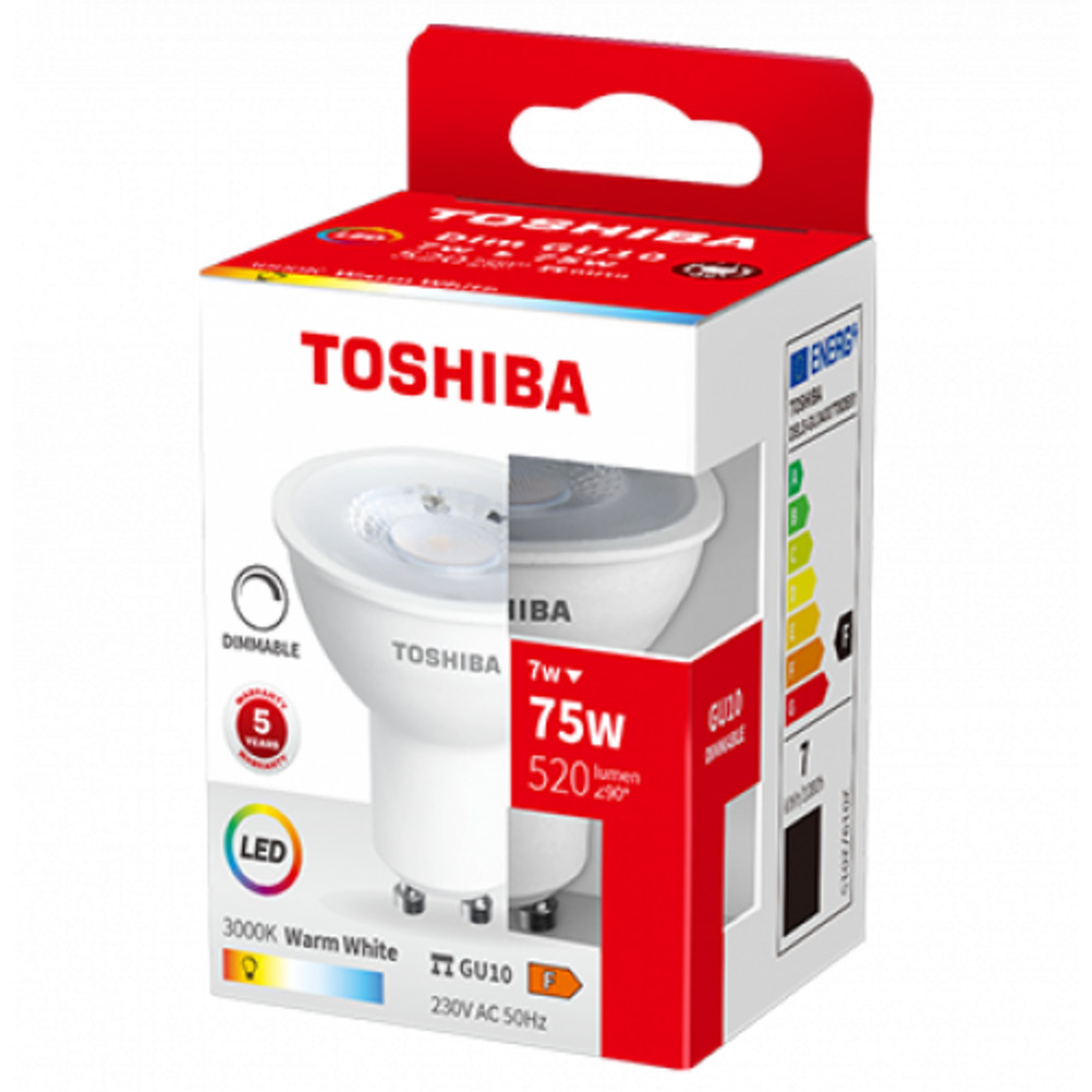 LED lámpa , égő , szpot , GU10 foglalat , 7 Watt , 36° , meleg fehér , dimmelhető , TOSHIBA , 5 év garancia