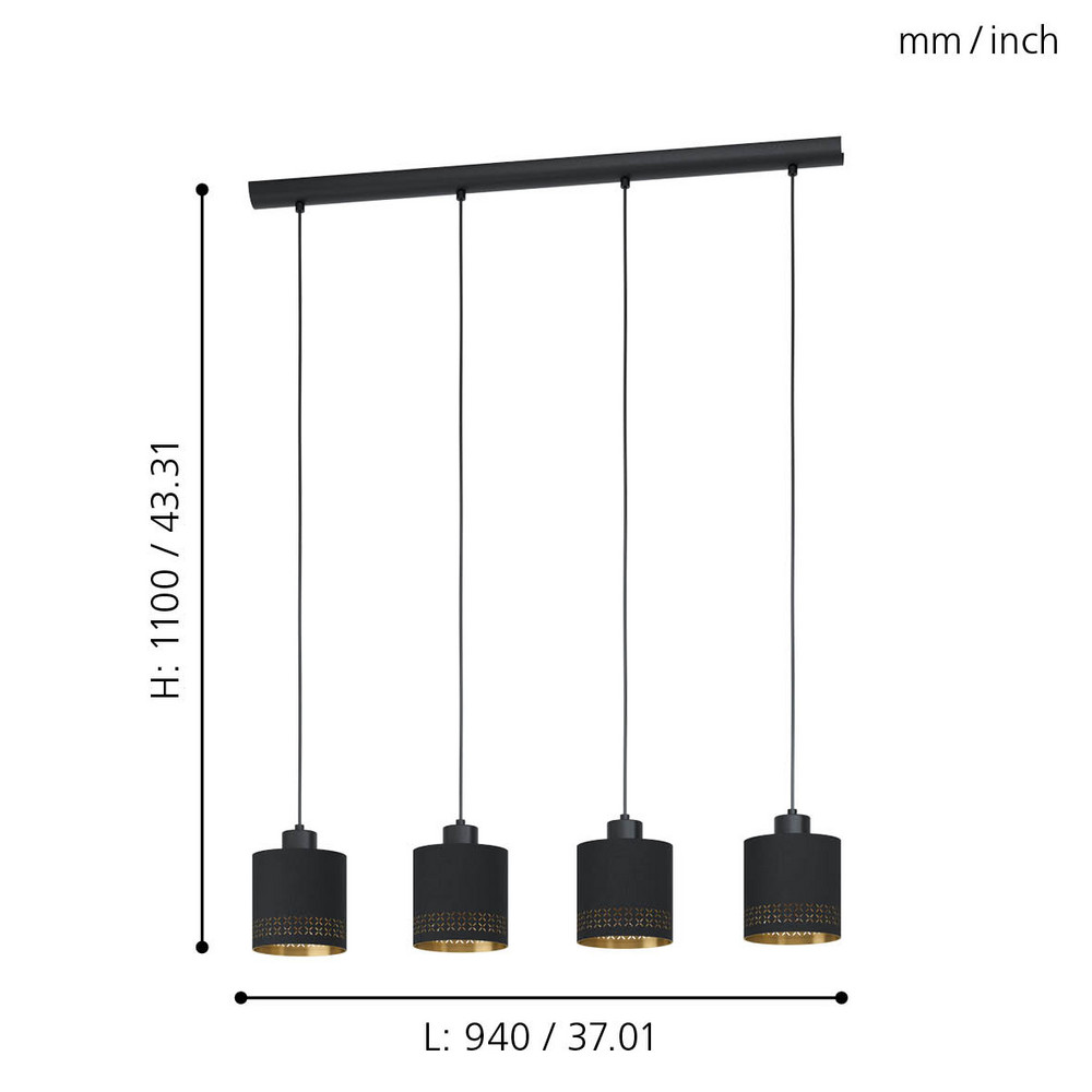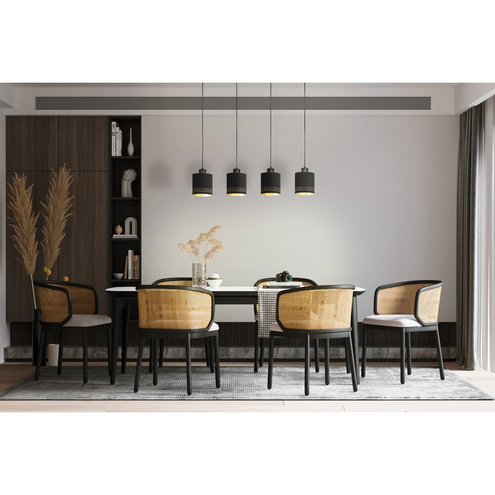 Az ESTEPERRA fekete fém vázból készül, és négy kerek lámpaburával rendelkezik, melyek fekete szövetből készültek belső arany béléssel. A lámpaburák széle körül kis kivágások találhatóak, melyek lenyűgöző fény-árnyék játékot hoznak létre, amint bekapcsolódik a fény. Ez a lámpa szinte bármilyen otthoni belsővel összeolvad, és stílusos világítást biztosít bármely térnek, legyen az a nappali vagy egy hosszú asztal fölé a étkezőben. A termék 4 darab E27 foglalatú izzót igényel, melyek nem tartozékok.