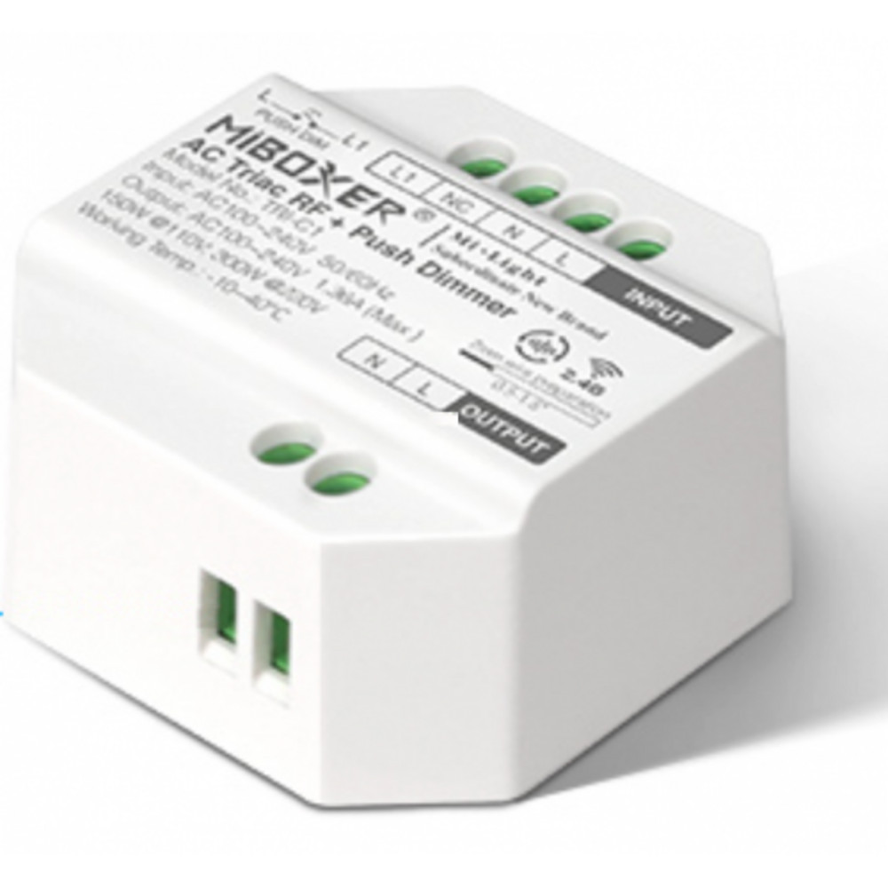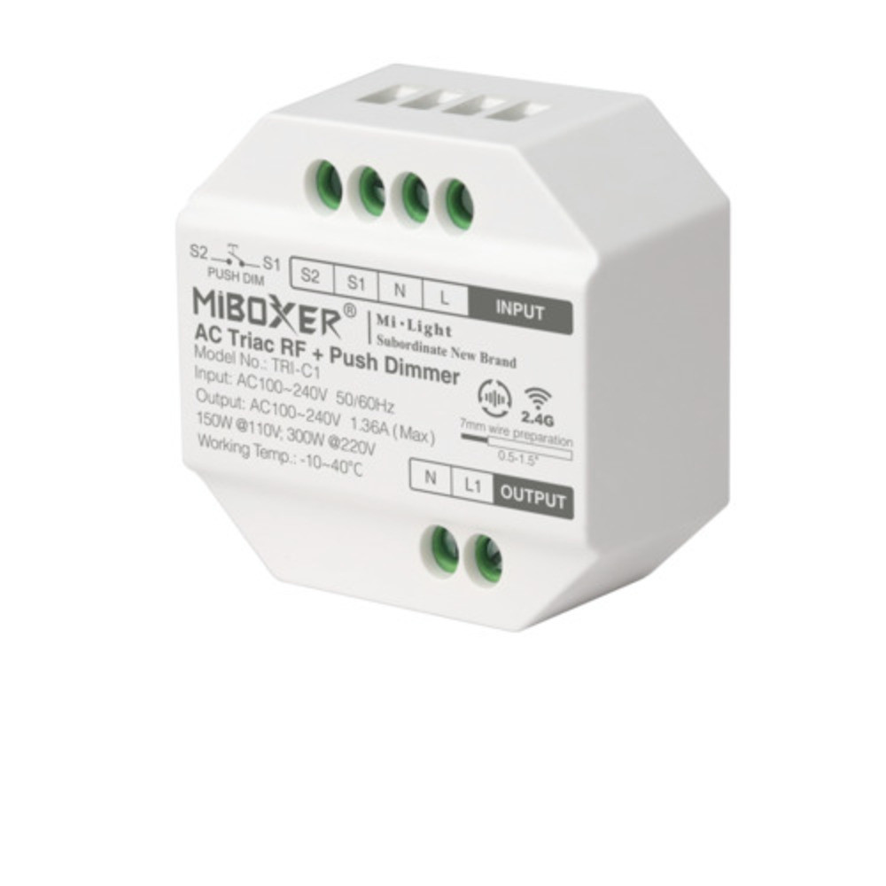 A TRI-C1 egy kisméretű vezérlő (akár egy felületi kapcsoló mögé süllyeszthető), amely RF jelet fogad a Mi-Light távirányítóktól, és 230 V AC oldalon dimmel, a következő módozatokon: