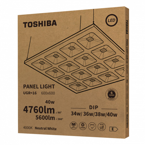 LED panel , 600 x 600 mm , 34-40 Watt , 4050-4760lm , 119 lm/W , természetes fehér , UGR<16 , TOSHIBA , 5 év garancia