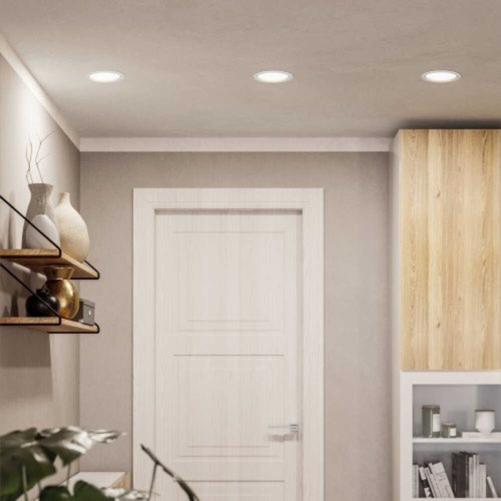 • Kompakt méret és diszkrét dizájn: A panel átmérője 16.6 cm, ami megfelelő méretet biztosít kisebb és közepes helyiségek világítására is. A kerek, fehér műanyag burkolat modern és letisztult megjelenést nyújt, könnyen illeszkedik a mennyezetbe, és diszkrét módon látja el a világítási feladatokat.