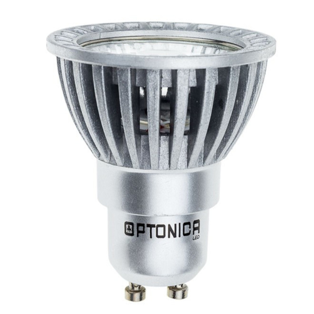 Optonica GU10 LED spotlámpa, 50° sugárzási szög, COB technológiával. Teljesítmény 4 W, fényáram 320 lm (kb. 80 lm/W), színhőmérséklet 6000 K – hideg fehér fény. Ezüst burkolat és GU10 foglalat, egyszerű cserélhetőség meglévő spot- és sínes lámpatestekbe.