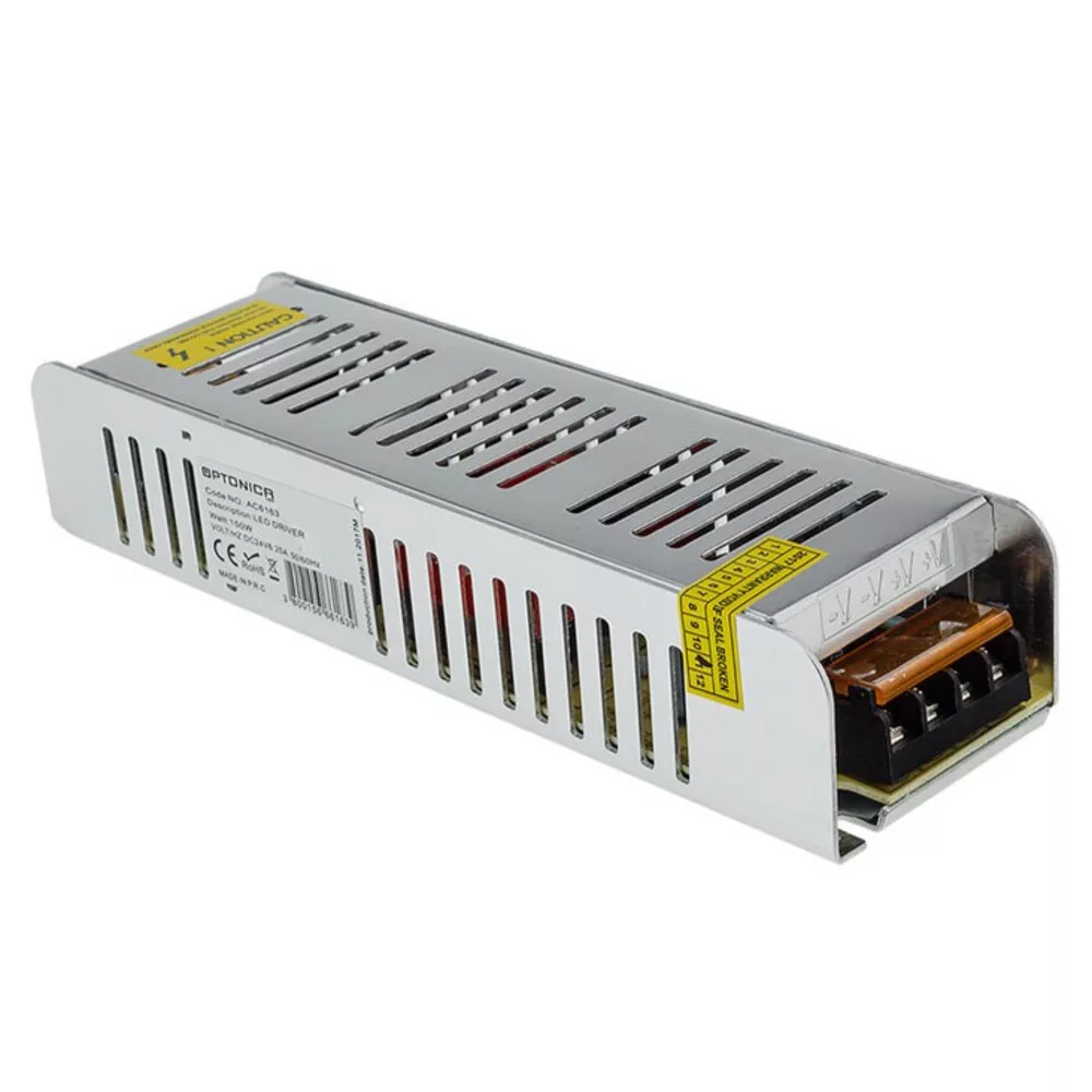 Optonica vékony fémházas LED tápegység, 150W teljesítménnyel. Kompakt, alacsony profilú kialakítású tápegység, amely kifejezetten LED szalagok és egyéb alacsonyfeszültségű LED világítások megbízható táplálására szolgál. A masszív fémház jó hőelvezetést biztosít, így passzív hűtéssel is stabil működés érhető el, ugyanakkor érdemes biztosítani a megfelelő szellőzést a hosszú élettartam érdekében. Beépített védelmi funkciók (rövidzárlat, túlterhelés, túlmelegedés) növelik a biztonságot és védik a fényforrásokat. Kompatibilis professzionális és lakossági felhasználással egyaránt, könnyen szerelhető fixálófuratokkal és egyszerű csatlakoztatási lehetőségekkel. Ideális alkalmazások: LED szalagok, bútorvilágítás, vitrinelemek, konyhai munkalapok és üzletberendezések. Gyártói minőség és megbízhatóság, a szabványoknak megfelelő tanúsítványokkal.