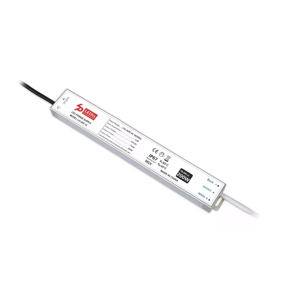 LED tápegység , 12 Volt , 200 Watt , 16.6A , slim , kültéri , vízálló , IP67 , 3+2 év garancia , LEDis , LD-200-12