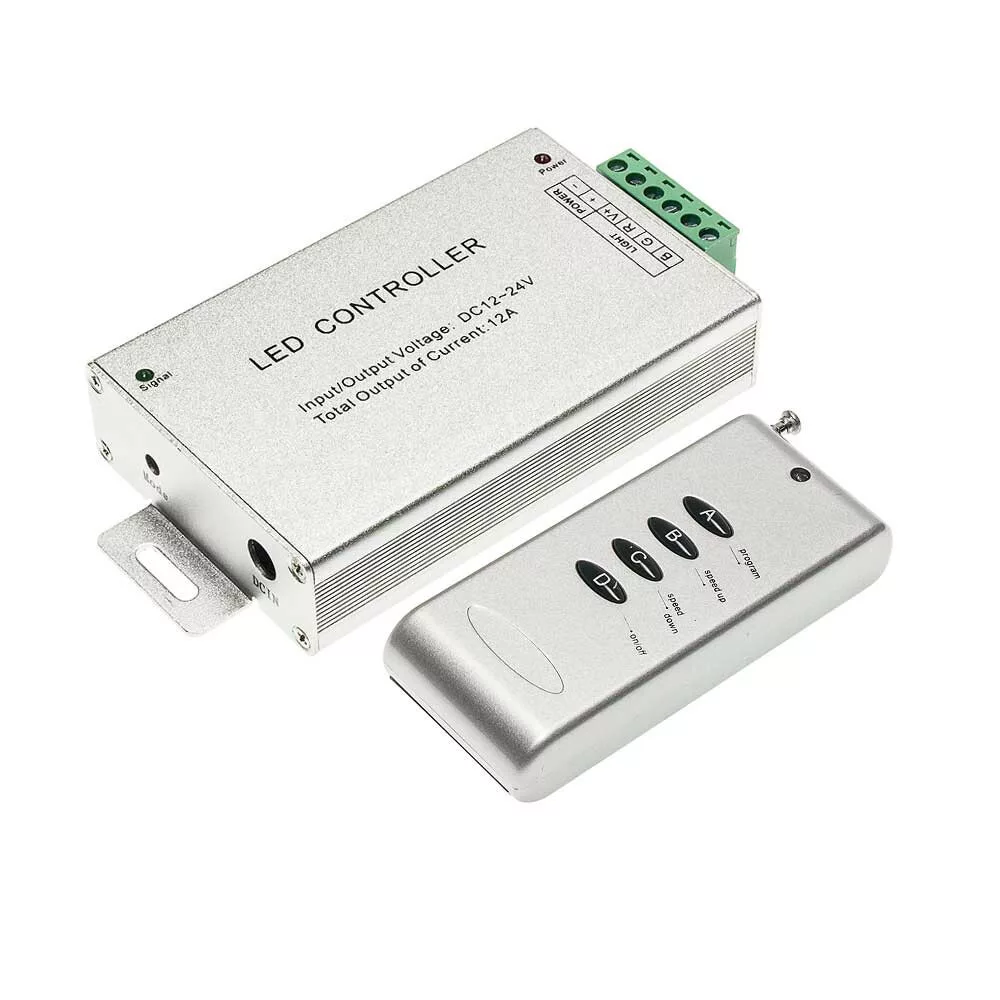 Optonica rádiós, négygombos LED távirányító RGB szalagok vezérléséhez. Kompakt, egyszerű kezelőfelületével intuitív módon teszi lehetővé a világítás be- és kikapcsolását, valamint a színek és világítási effektek gyors váltását; jellemzően a fényerő és alapvető színmódok szabályozására alkalmas. Rádiós működése miatt nem igényel közvetlen rálátást a vezérlőre, így kényelmes, rugalmas elhelyezést biztosít a helyiségen belül. Terhelhetősége 144 W-ig alkalmas, így otthoni és kisebb kereskedelmi alkalmazásokhoz egyaránt megfelelő, ha az RGB vezérlő kompatibilis a rádiós távirányítóval. Kis mérete és egyszerű párosíthatósága megkönnyíti a telepítést és a mindennapi használatot, különösen hangulatvilágítások, bútorvilágítások és dekorációs megoldások vezérlésénél.