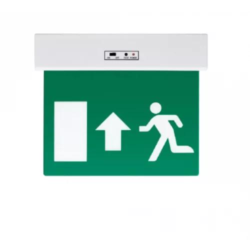 LED diódával szerelt menekülési irányt jelző vészvilágító, kijárat mutató tábla. Az akkuk a ledeket 3 órán át képesek üzemeltetni áramszünet, illetve vészhelyzet esetén.