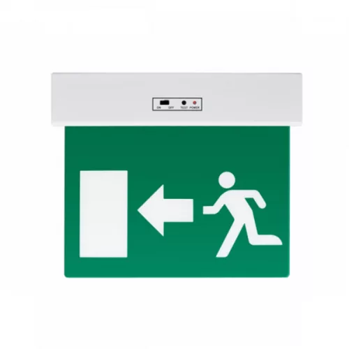 LED diódával szerelt menekülési irányt jelző vészvilágító, kijárat mutató tábla. Az akkuk a ledeket 3 órán át képesek üzemeltetni áramszünet, illetve vészhelyzet esetén.
