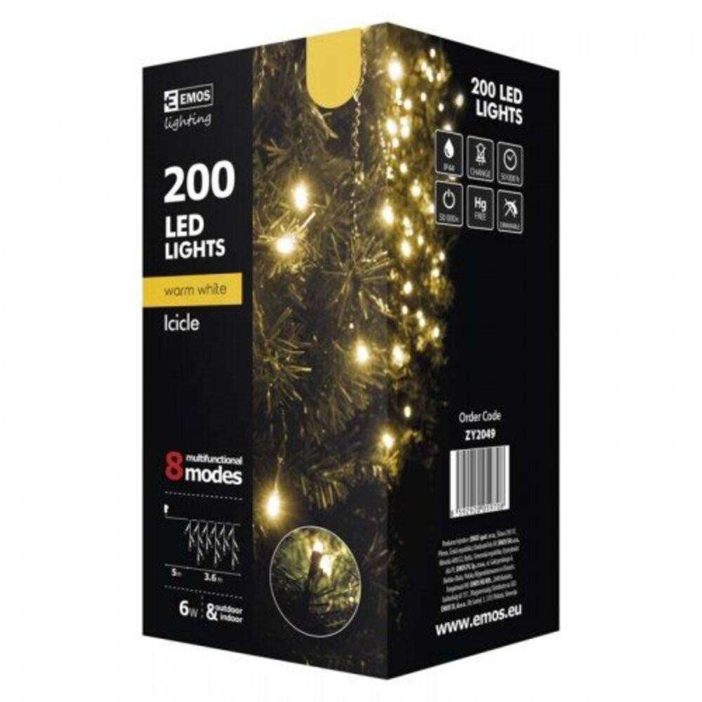 Led fényfüzér , beltéri/kültéri , 200 db LED , 3.6 m , meleg fehér , 8 programos , jégcsap , IP44