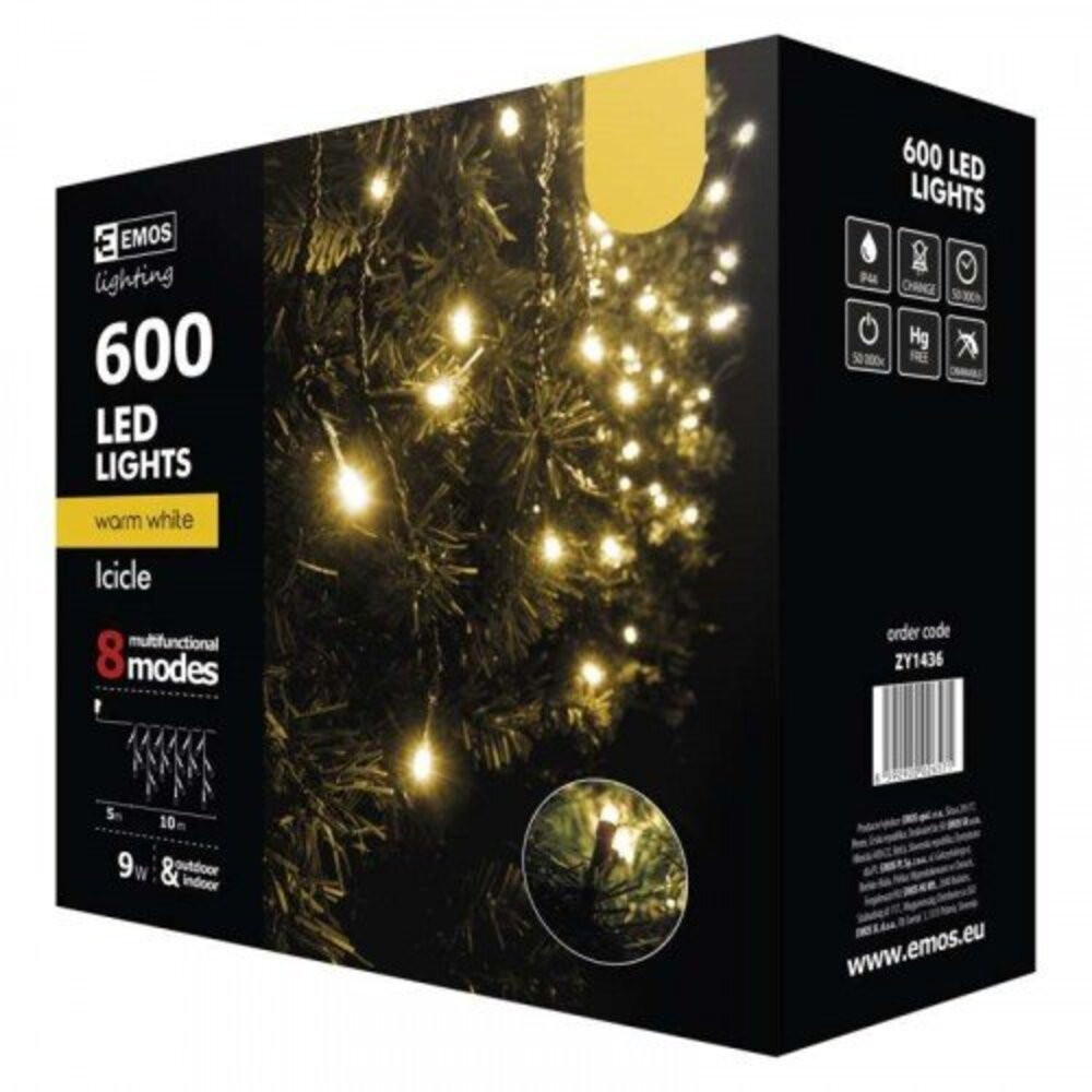 Led fényfüzér , beltéri/kültéri , 600 db LED ,10 m , meleg fehér , 8 programos , jégcsap , IP44
