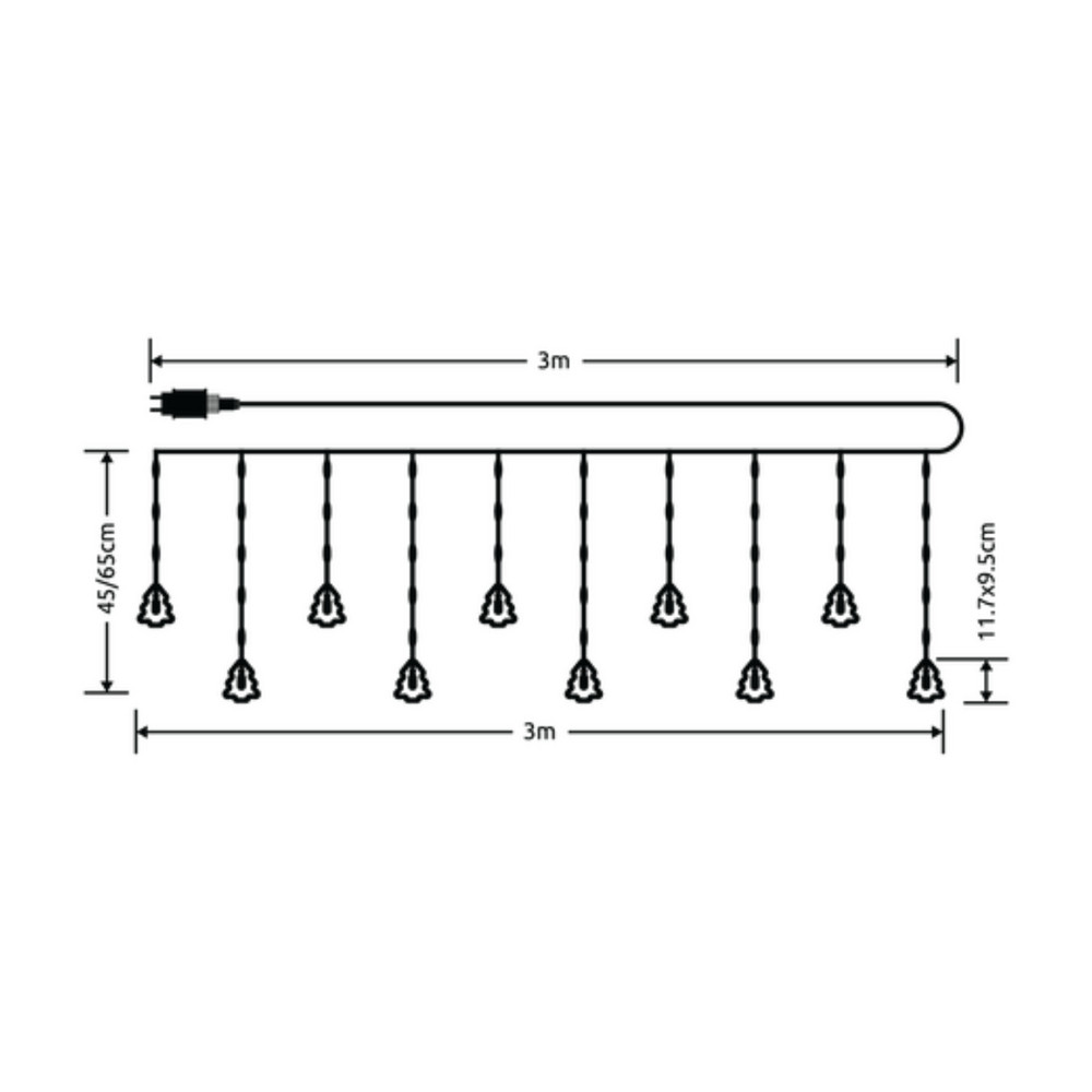 Méreteit tekintve 6 méter hosszú, ez a hossz meg van felezve, ugyanis az átlásztó kábel túlsó feléről lógnak le a karácsonyfa formájú díszek, 45-65 cm hosszan, amikre összesen 110 darab LED chip van szerelve. Maguk a díszek 11,7 cm magasak és 9,5 cm szélesek. Felhelyezése roppant egyszerű. Csatlakozás szempontjából EU szabvány dugvillával csatlakoztatható a hálózatra.