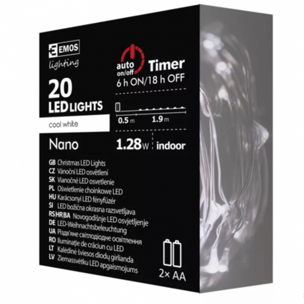 Led fényfüzér , beltéri , nano LED , 1.9 m , hideg fehér , ezüstszálas , időzíthető , elemes