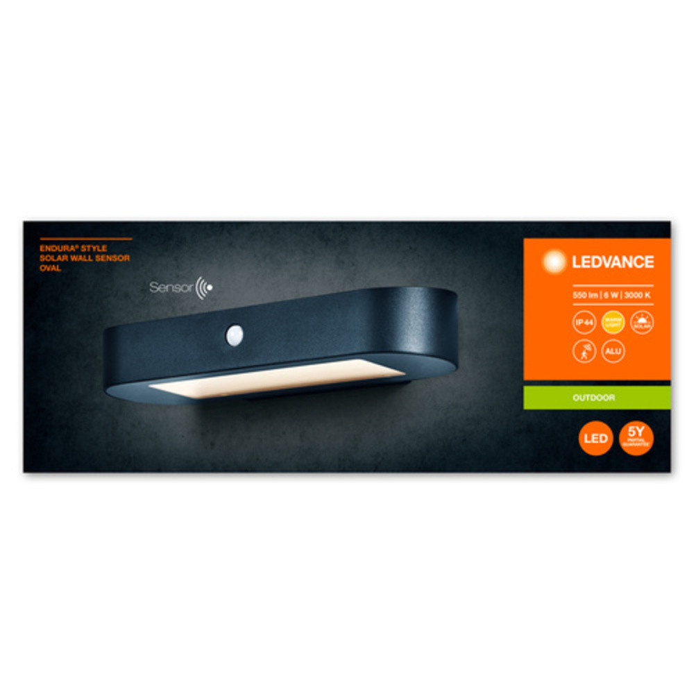 Kültéri Endura Style tojásdad falérzékelő. Termékjellemzők: Napenergiával működő kültéri LED lámpatest. PIR mozgásérzékelő és nappali fényérzékelő. Elérhető 3000 K vagy 4000 K színhőmérséklettel. Akkumulátor töltése napelem segítségével. Termék előnyei: Könnyű és gyors telepítés. Igény szerinti világítás és energiatakarékosság a mozgás- és nappali fényérzékelőnek köszönhetően. Magas minőségű anyagok. Alkalmazási területek: kültéri használat (IP44). Garázsok. Épület homlokzatok.
