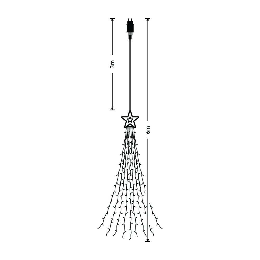 Méreteit tekintve 6 méter hosszú, ez a hossz meg van felezve, a felénél elhelyezkedő nagy szintén világító csillagból lógnak le a 3 méter hosszú kábelek, amikre összesen 300 darab LED chip van szerelve. Felhelyezése roppant egyszerű. Csatlakozás szempontjából EU szabvány dugvillával csatlakoztatható a hálózatra.