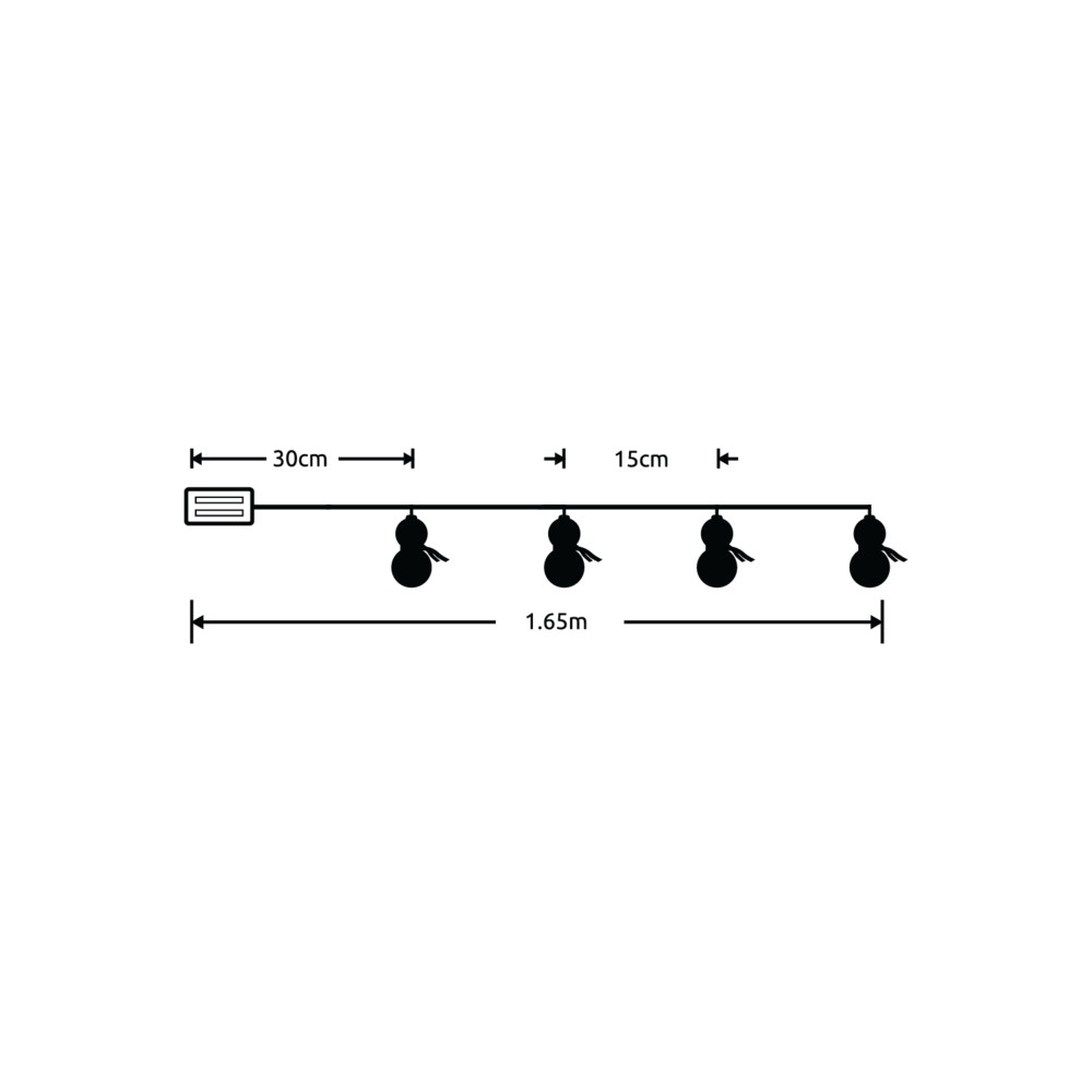 Méreteit tekintve 135 centiméter hosszú és összesen 10 LED chip van rászerelve. A hóember formájú izzók 15 centiméterenként helyezkednek el. A füzérhez 30 centiméteres kábellel egy elemtálca csatlakozik, amelybe 2 darab ceruza (AA) méretű elemet helyezve tudjuk használni a fénysort. Amennyiben ilyen méretű elemből jó minőségű, tartós változatot helyezünk a készülékbe, az akár 3 napot is bír folyamatos használat mellett.