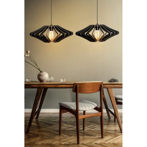 Ez a precízen és gondosan elkészített csillár masszív mdf testtel rendelkezik, amely biztosítja a tartósságot és a hosszú élettartamot. A karcsú fekete szín modern és elegáns jelleget kölcsönöz, így tökéletesen illik bármilyen kortárs vagy skandináv ihletésű belső térbe.