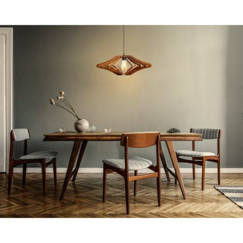 Angyali csillárunk aprólékosan kidolgozott, 3 mm-es mdf-testtel készült, amely biztosítja a tartósságot és a hosszú élettartamot. A diófa szín gazdagságot és kifinomultságot kölcsönöz az általános kialakításnak. Az állítható kábel lehetové teszi, hogy a magasságot a helyiséghez igazítsa, így sokoldalú és alkalmazkodó.