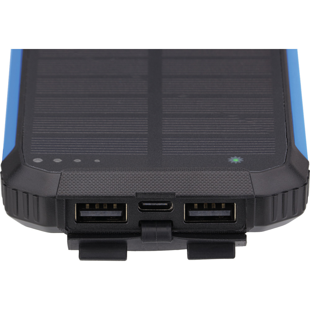 Kompakt, hordozható 10000 mAh kapacitású power bank napelemes feltöltési lehetőséggel, mely 3,7 V névleges feszültségű cellákat tartalmaz. A beépített napelem kiegészítő töltést biztosít 1,2 W teljesítménnyel, ami ideálissá teszi a készüléket kültéri használatra és vészhelyzeti energiapótlásra. A készülék 2 W teljesítményű beépített LED világítással rendelkezik, amely praktikus éjszakai fényként vagy jelzőfényként használható. Masszív, modern kialakítás fekete és kék színváltozatban, egyszerű kezelhetőséggel. Alkalmas okostelefonok, kisebb táblagépek és USB-táplálású eszközök töltésére útközben, kempingezéskor vagy áramkimaradás esetén. Használat előtt javasolt a készülék műszaki leírásának és töltési útmutatójának áttanulmányozása a hosszú élettartam és biztonságos működés érdekében.