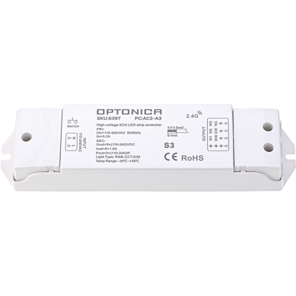 RGB/CCT/fényerőszabályzós 3 csatornás nagyfeszültségű LED szalagvezérlő, Optonica, 6397