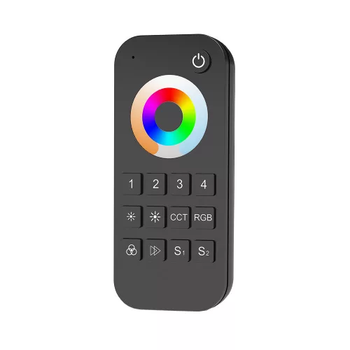 Optonica fekete RGB+színhőmérséklet távirányító — professzionális vezérlés LED világításokhoz. Egyetlen eszközzel szabályozhatja az RGB színeket és a fehér fény színhőmérsékletét (meleg–semleges–hideg), továbbá fokozatmentes dimmelési lehetőséget biztosít a kívánt hangulat és fényerő eléréséhez. Ergonomikus, letisztult kivitelű ház és jól elkülönített gombok a gyors, intuitív kezelésért; előre beállított színmódok és finomhangolási lehetőségek segítik a precíz beállítást. Kompatibilis RGB+CT vezérlőkkel, könnyen párosítható, memóriával rendelkezik a legutóbbi beállítások megtartásához. Ideális otthoni és kereskedelmi környezetbe egyaránt, ahol rugalmas, esztétikus világításvezérlésre van szükség.