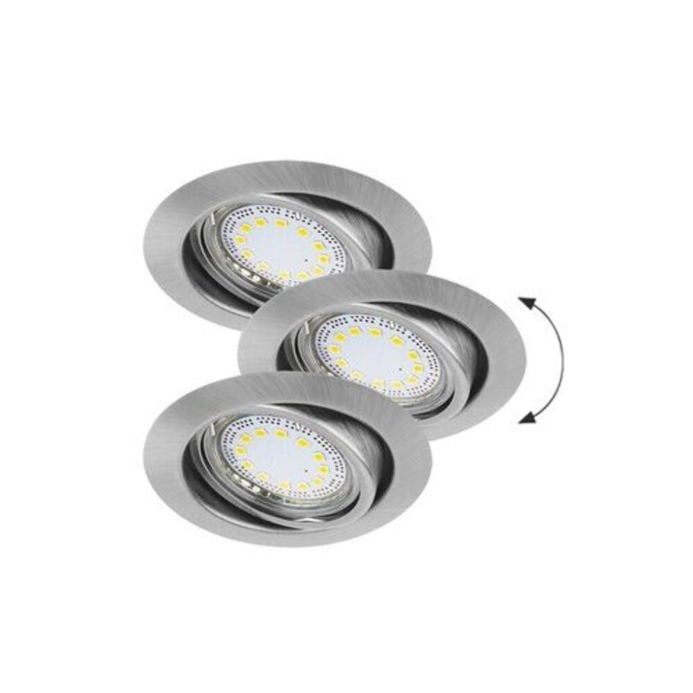 Gipszkarton álmennyezetbe, bútorlapba és polisztirol díszlécbe is beépíthető, modern megjelenésű LED spotlámpa szett (3 db és csomag), szatin króm színben. A spotok billenthetők, a fény iránya állítható. A 3x3W teljesítményű LED fényforrások 3x240 lumenes fényerőt biztosítanak, melegfehér (3000 Kelvin) színhőmérséklettel. GU10-es foglalatú, maximum 3x50W teljesítményű energiatakarékos fényforrásokkal üzemeltethetők. A lámpatestek IP40-es védettségel rendelkeznek, mely védelmet jelent nemcsak a por, hanem az apróbb szilárd tárgyak ellen is.