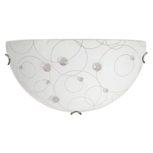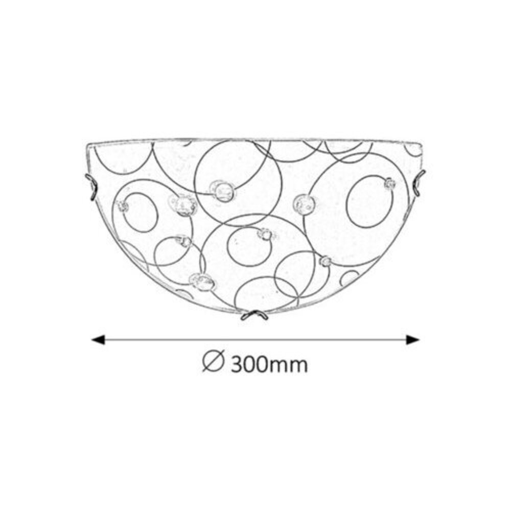 30 cm átmérőjű, hagyományos fali lámpa, fém és műanyag szerkezettel, kiváló minőségű, üveggyöngyözött, fehér alapszínű, inda mintás lámpabúrával. E27-es foglalatú, maximum 60W teljesítményű, halogén vagy LED fényforrással is használható.