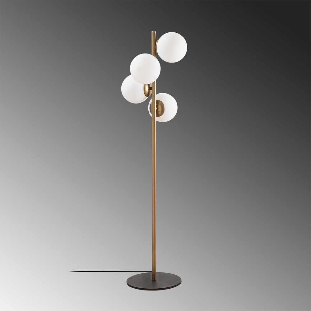 Skandináv állólámpa, arany fém ház, 130 cm magas, 32 x 32 cm talp, 4 x E27 aljzat (max. 40 W), elegáns üvegkupak, 200 cm kábelhossz, stílusos világítás modern lakberendezéshez és lakóterekhez