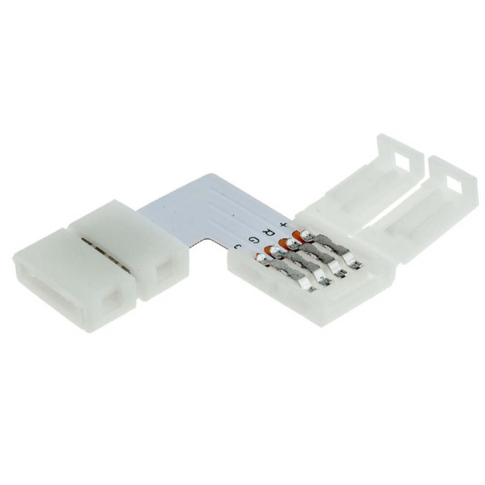 Sarok csatlakozó RGB LED szalaghoz, 10 mm, Optonica. Professzionális, 90°-os sarokcsatlakozó 10 mm szélességű, négypólusú RGB LED szalagok gyors és megbízható összekapcsolásához. Forrasztásmentes kivitel, egyszerű, eszköz nélküli szerelés: a szalag behelyezése és a rögzítőfül lezárása biztosítja az érintkezést. Átlátszó, alacsony profilú ház könnyen illeszthető szegélyekhez és rejtett világítási megoldásokhoz. Réz/alumínium alapú érintkezők biztosítják az elektromos kapcsolat stabilitását és jó vezetőképességet. Kompatibilis 10 mm széles RGB (négypólusú) flexibilis LED szalagokkal, például 5050 típusokkal, beltéri világítási alkalmazásokhoz ideális; alkalmas sarokkihajlásokhoz, bútorvilágításhoz, karnis- és indirekt világításhoz. Tartós kivitel, egyszerű csatlakoztatás és tiszta, rendezett vezetékezés a professzionális megjelenés érdekében.