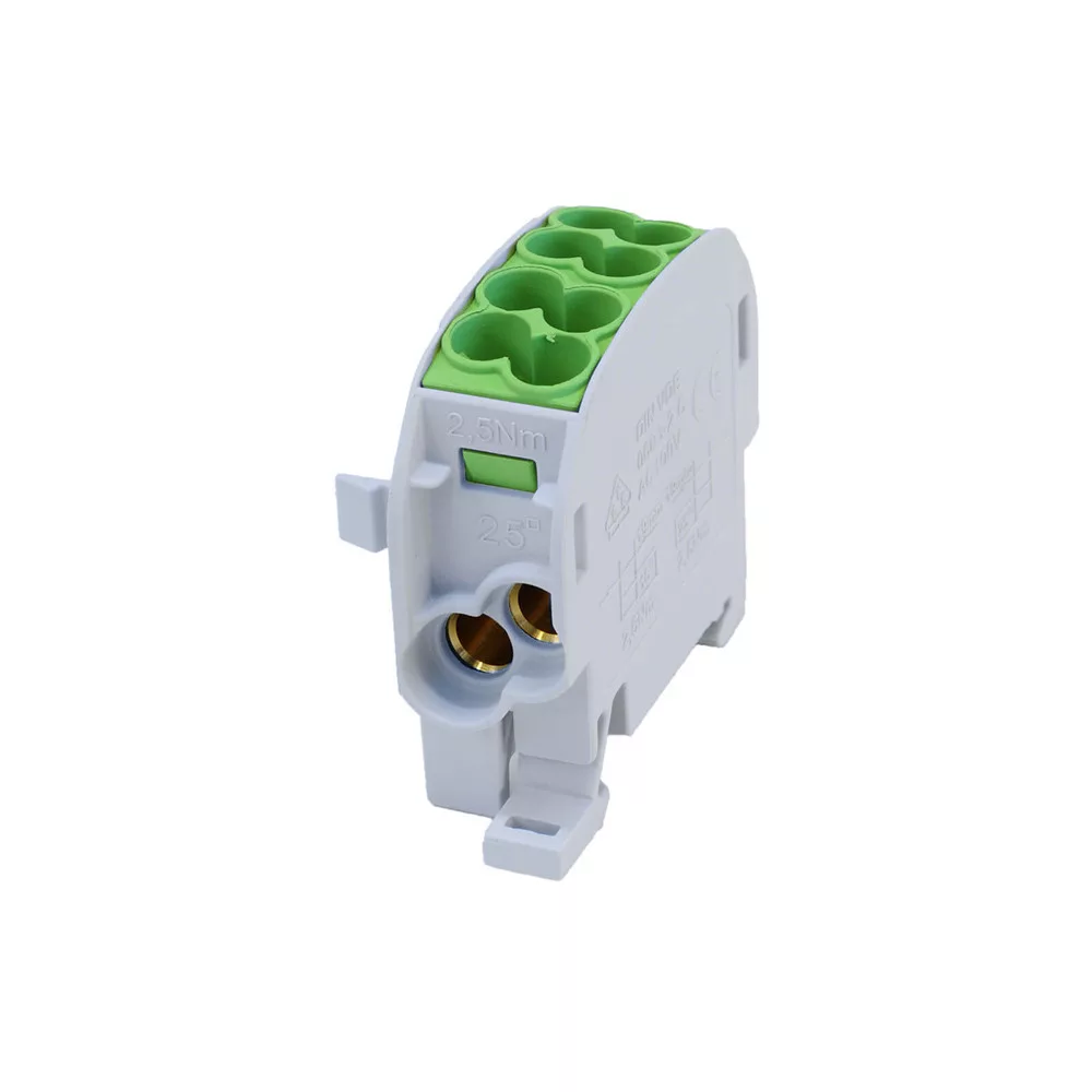 A DIN sínre szerelhető sorkapocs, amely 2 x 16 mm² és 2 x 25 mm² vezetések csatlakoztatására alkalmas, ideális megoldás elektromos rendszerekben. Ez a sorkapocs zöld színben kapható, amely elősegíti az egyszerű azonosítást és a rendszeren belüli vizuális szervezést. Kiválóan alkalmazható különböző ipari és otthoni elektromos installációkban, és a tervezése során figyelembe vették a biztonságos és megbízható csatlakoztatást az elektromos áramkörökben.