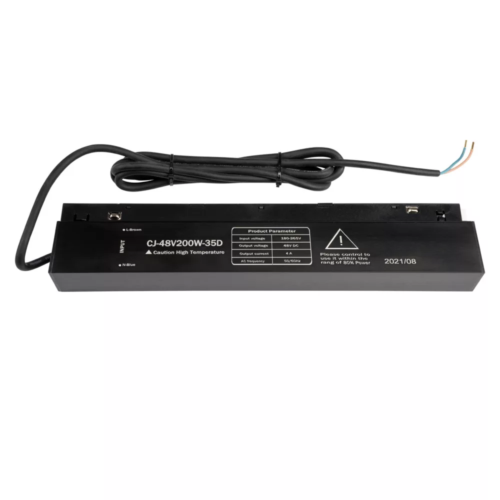 Optonica márkájú tápegység mágneses reflektorokhoz, M35 szélességre tervezve. A 200 W teljesítményű egység stabil és megbízható áramellátást biztosít mágneses sínrendszerű világítótestek számára, megkönnyítve a nagyobb teljesítményigényű reflektorok üzemeltetését. Masszív, fekete kivitelű háza esztétikus megjelenést és jó hőelvezetést biztosít, a készülék pedig egyszerűen integrálható meglévő mágneses sínekbe. Beépített védelmi funkciók (túlterhelés- és rövidzárlat-védelem) növelik a biztonságot és a hosszú távú megbízhatóságot. Ideális választás kereskedelmi, bemutatótermi és ipari világítási alkalmazásokhoz, ahol stabil, nagy teljesítményű tápellátásra van szükség.