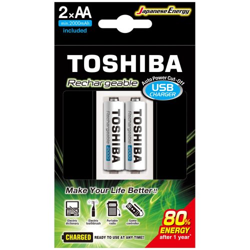 Újratölthető elem + töltő, AA, 1,2V, 2 db elem/csomag, TOSHIBA, 00159080