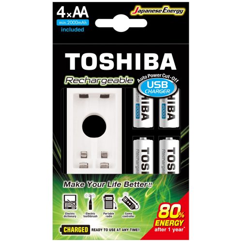 Újratölthető elem + töltő, AA, 1,2V, 4 db elem/csomag, TOSHIBA, 00159079