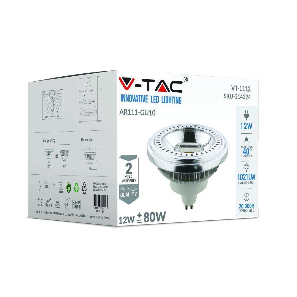 LED spot égő AR111, 12w, 3000K, meleg fehér, 1021lm, GU10, 40°, ezüst, CRI>90, V-TAC, 214224