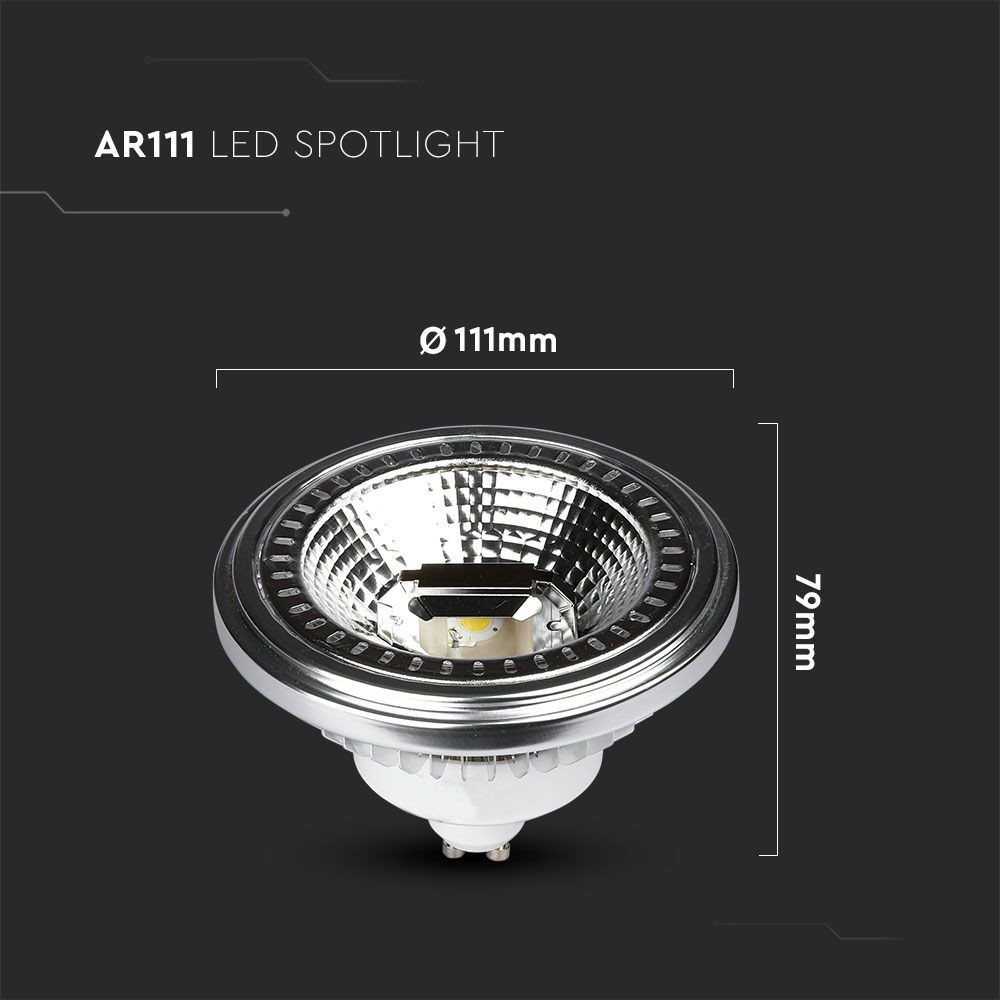 LED spot égő AR111, 12w, 6400K, hideg fehér, 1117lm, GU10, 40°, ezüst, CRI>90, V-TAC, 214225