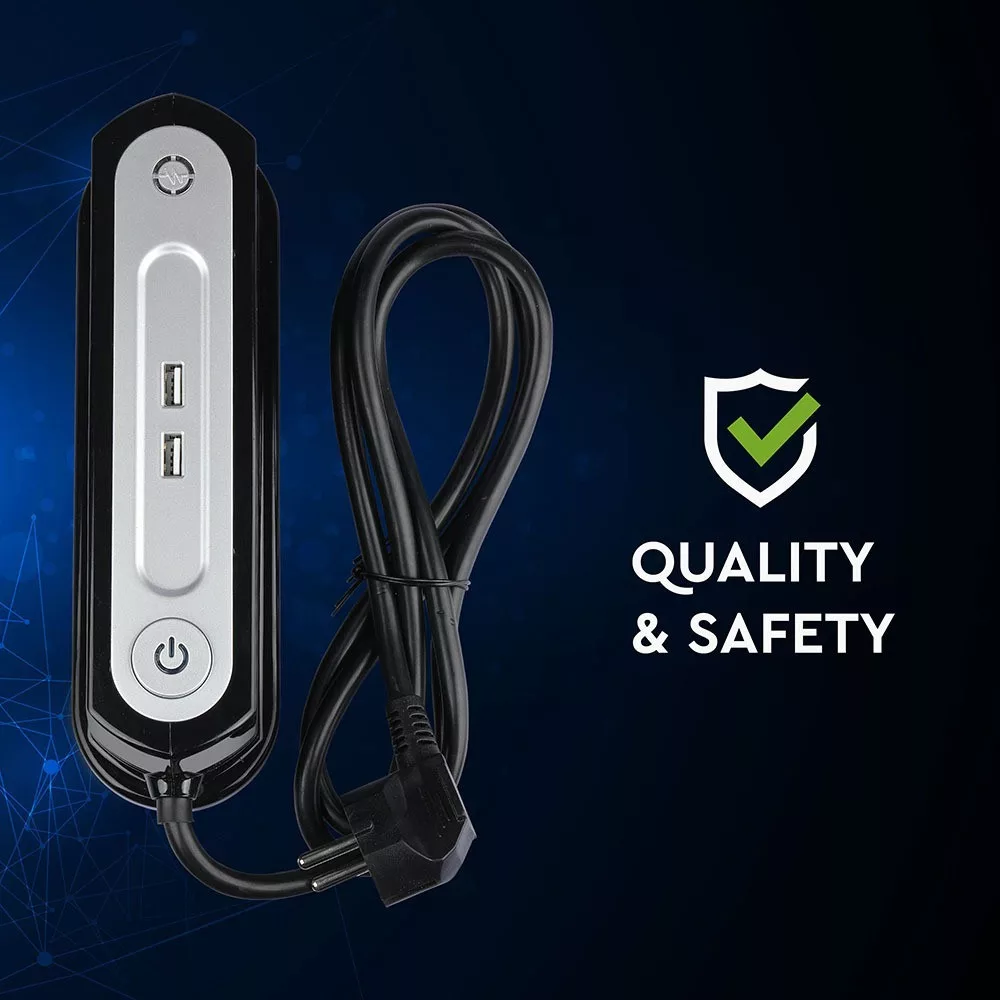 Bemutatkozik a VT-1133-2, egy sokoldalú, 3 állású asztali aljzat, amelyet a maximális kényelem és hatékonyság érdekében terveztek. Ez a hosszabbító aljzat világító kapcsolóval rendelkezik a könnyű hozzáférés érdekében, és két USB-porttal, amelyek lehetővé teszik több eszköz egyidejű töltését. Robusztus, PC, PVC és réz anyagokból készült konstrukció biztosítja a tartósságot és a biztonságot. AC 230V bemeneti teljesítményével és 3500 watt maximális terhelhetőségével ez az aljzat tökéletes otthoni vagy irodai környezetbe. 225 mm széles, 65 mm hosszú és 73 mm magas, így zökkenőmentesen illeszkedik bármilyen munkaterületre. Az 1,4 méteres vezetékhossz bőséges hatótávolságot biztosít, míg a kompakt kialakítás rendezetten tartja az asztalát. A 250 lumenes hatékony megvilágítású VT-1133-2 hatékonyan működik különböző hőmérsékleteken, és tartós garanciával rendelkezik. Ideális azok számára, akik energiatakarékos megoldásokat keresnek, ez a modern aljzat a funkcionalitást a stílussal ötvözi, elegáns fekete kivitelben.