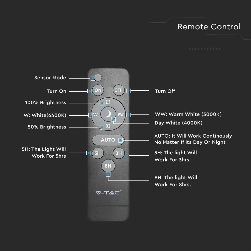 Szolár LED fali lámpatest mozgásérzékelővel és távirányítóval, 18w, CCT, 1000lm, 120°, fehér, CRI>80, IP65, V-TAC, 6500