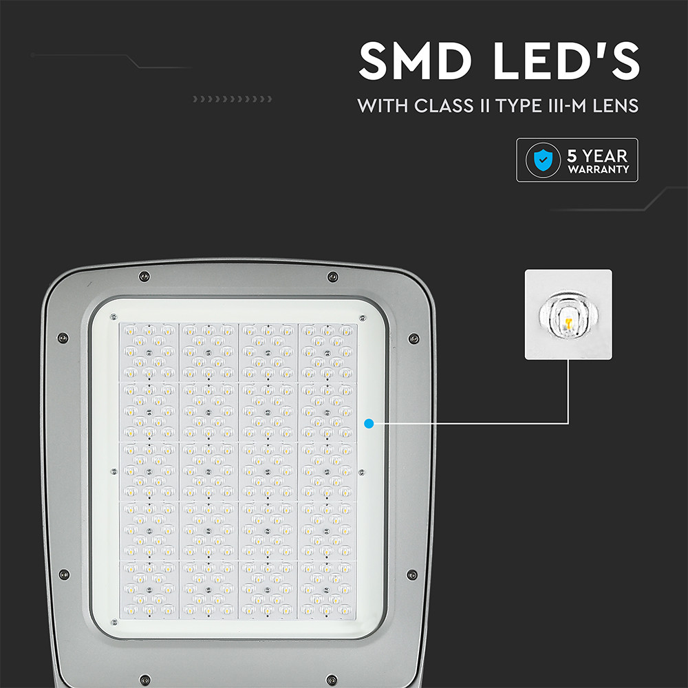Bemutatkozik a VT-200ST 200 W-os LED-es utcai lámpa, amelyet az optimális teljesítmény és energiahatékonyság jegyében terveztek. Ez az utcai lámpa tartós, fröccsöntött alumínium házzal és 30 000 órás élettartammal rendelkezik, így megbízható választás kültéri világításhoz. III-M típusú lencsével felszerelve, 150x80°-os sugárzási szöget kínál, kiváló megvilágítást biztosítva az utakon, parkolókban és egyéb nyilvános területeken. A fejlett Samsung SMD 3030 chipeket használva és lenyűgöző, 130 lumen/watt teljesítményt nyújtva ez az utcai lámpa fényes nappali fehér fényt (4000K) és 26 000 hasznos lument bocsát ki, így biztonságot és láthatóságot biztosít sötét környezetben. 176-265 V AC bemeneti teljesítménytartománnyal és 50/60 Hz-es frekvenciával ez a nem szabályozható egység 0,9-nél nagyobb teljesítménytényezővel és 70 feletti színvisszaadási indexszel (CRI) büszkélkedhet. Az IP65 víz- és porállóságú VT-200ST zord időjárási körülményeknek is ellenáll, -20°C és +45°C közötti üzemi hőmérséklet-tartományban. 5 év garanciával rendelkezik, ami megerősíti a minőség és a hosszú élettartam iránti elkötelezettségünket. A termék elegáns szürke kivitelben kapható, és könnyen sorba szerelhető. Tökéletes városi és elővárosi alkalmazásokhoz, ez a LED-es utcai lámpa nemcsak akár 85%-kal csökkenti az energiafogyasztást a hagyományos világításhoz képest, hanem hozzájárul a fenntarthatóbb környezethez is. A csomagolás dobozonként egy egységet, raklaponként pedig 24 egységet tartalmaz a hatékony szállítás érdekében.