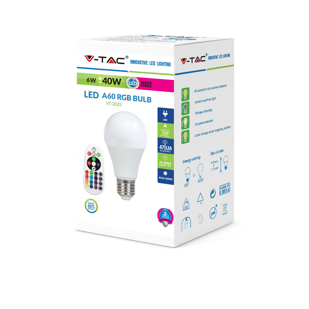 VT-2022 6W A60 RGB Izzó (Távirányítóval Szabályozható) 6400K E27