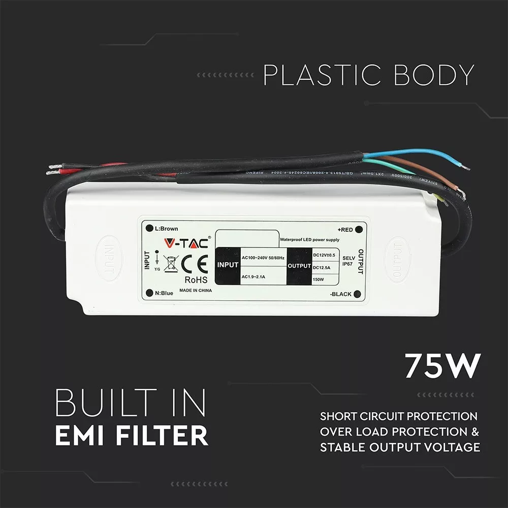 VT-22075 75 W-os LED műanyag vékony tápegység hatékony energiaátalakításra lett tervezve különféle világítási alkalmazásokban. Kompakt kialakításának köszönhetően, 166 mm széles, 43 mm hosszú és 33 mm magas, ez a tápegység ideális LED-szalagekhez. AC 100-240V bemeneti teljesítménytartományban működik 50/60Hz-en, és stabil DC 12V kimenetet biztosít, akár 6A kimeneti árammal. Az egység IP67 besorolású, így vízálló és beltéri, valamint kültéri telepítésre is alkalmas. Könnyű, tartós műanyagból készült házával a VT-22075 könnyen telepíthető és karbantartható, így megbízható választás bármilyen környezethez. Fehér színű és villogásmentes működésű, így kellemes világítási élményt nyújt. Bár nem szabályozható, a fix kimenet stabil teljesítményt biztosít a világítási igényeknek megfelelően. Ez a tápegység hosszú üzemidővel és hatékony energiafelhasználással büszkélkedhet, hozzájárulva az energiamegtakarításhoz, miközben kiváló minőségű teljesítményt nyújt. Minden doboz 40 darabot tartalmaz, így tökéletes nagy tételben történő megrendelésekhez és elosztott telepítésekhez.