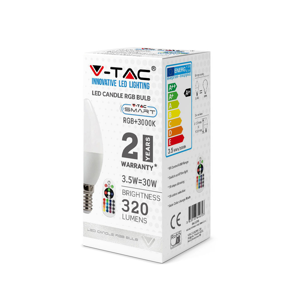 LED izzó SMART gyertya alakú E14 RF RGB, 3,5w, 6400K, hideg fehér, 320lm, 200°, fehér, CRI>80, dimmelhető, V-TAC, 2771