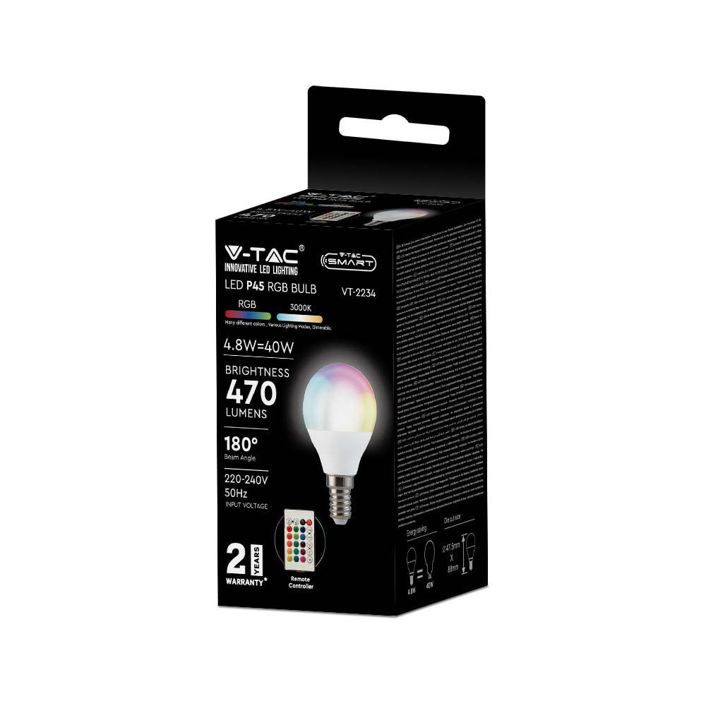 LED izzó SMART gömb alakú E14 RF RGB, 4,8w, 3000K, meleg fehér, 470lm, 180°, fehér, CRI>80, dimmelhető, V-TAC, 3029