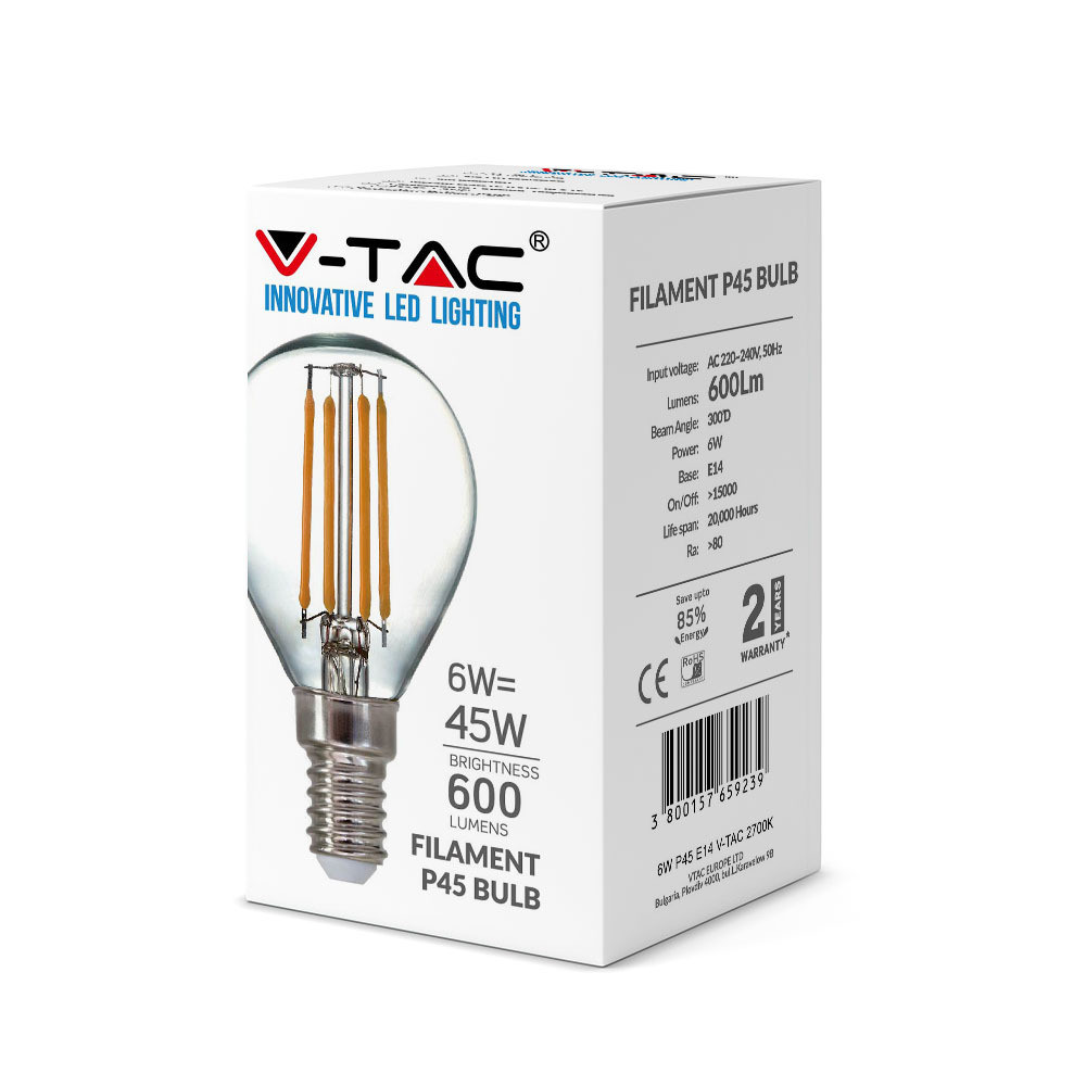 LED izzó átlátszó filament Clear gömb alakú E14, 6w, 2700K, meleg fehér, 600lm, 300°, CRI>80, V-TAC, 2845