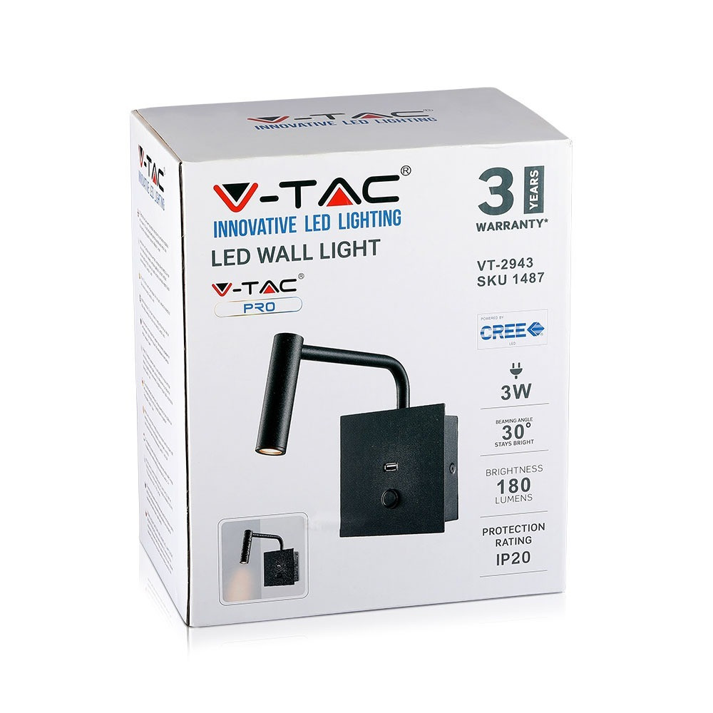 Fali LED olvasólámpa kapcsolóval és USB porttal, 3w, 3000K, meleg fehér, 180lm, 30°, fekete, CRI>80, V-TAC, 1487