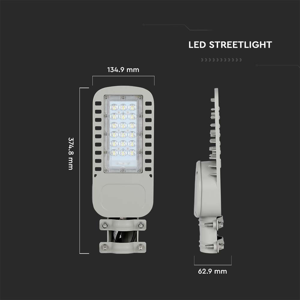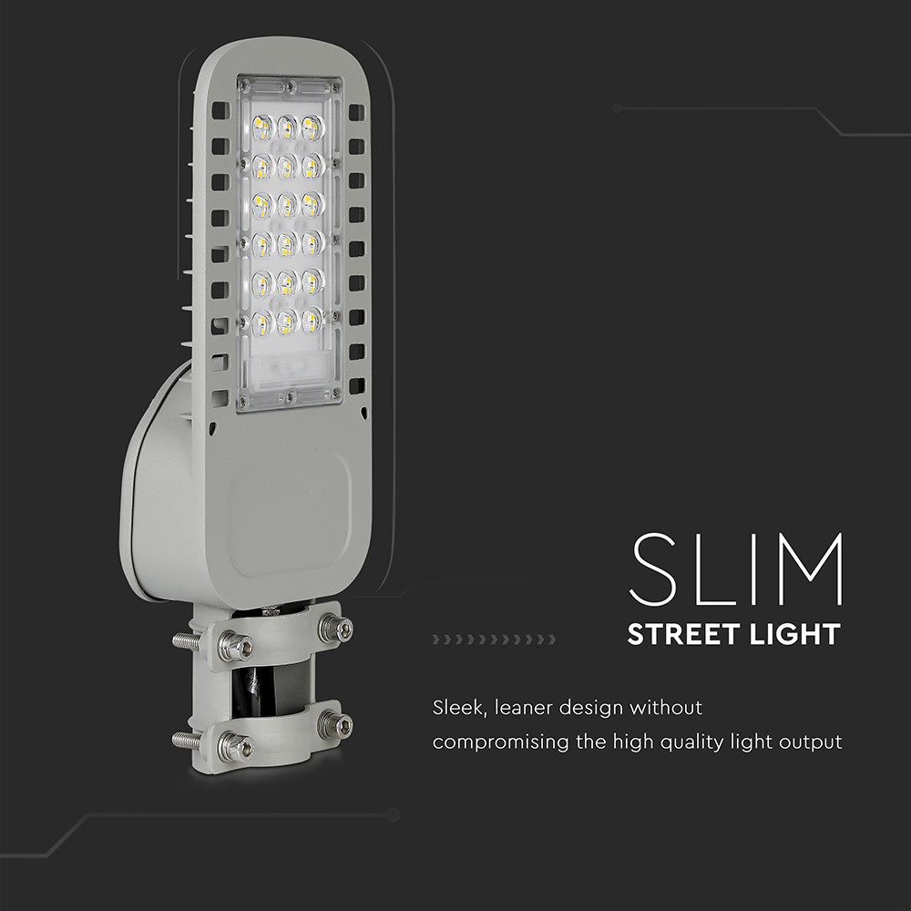 LED Vékony utcai lámpa, 30w, 6500K, hideg fehér, 4050lm, 120°, szürke, CRI>70, IP65, V-TAC, 21957