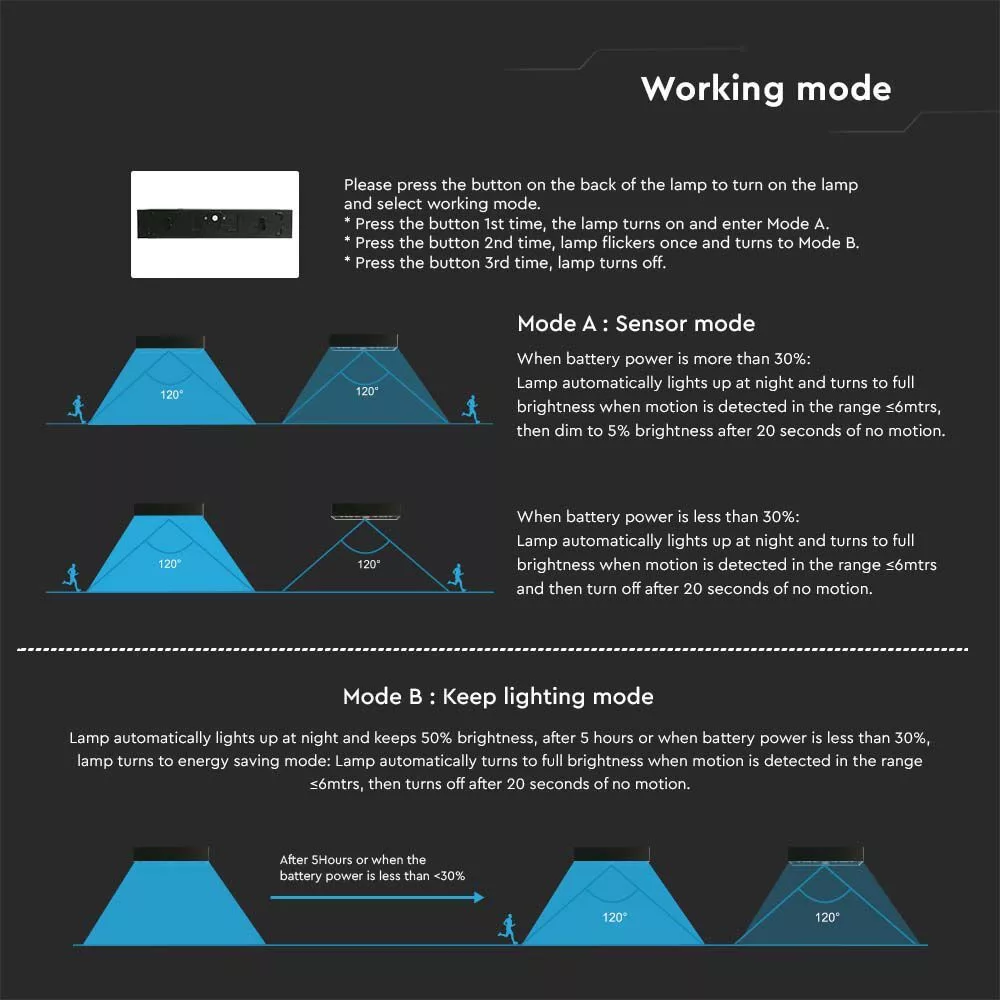 Bemutatkozik a VT-406 6W-os LED napelemes fali lámpa, amelyet kültéri terek hatékony és stílusos megvilágítására terveztek. Ez a napelemes fali lámpa robusztus 3,7 V-os 3000 mA-es lítium akkumulátorral rendelkezik, amely megbízható teljesítményt nyújt 900 lumenes fényerővel és kellemes 4000 K-es nappali fehér színhőmérséklettel. Tartós ABS és PC anyagokból készült, ez a fali lámpa hosszú élettartamra készült, IP65 vízállósági szabványnak megfelelően, így ellenáll a különféle időjárási körülményeknek. 140° x 70°-os sugárzási szögével széles megvilágítási lefedettséget biztosít, így tökéletes utak, kertek és teraszok megvilágítására. A kifinomult PIR-érzékelő hatékony mozgásérzékelést tesz lehetővé akár 6 méterig, biztosítva, hogy csak szükség esetén világítson. A lámpa minimális napfény mellett is hatékonyan működik, mindössze 8-10 óra töltést igényel legalább 4 éjszakai működéshez. 235 mm hosszú, 48 mm széles és 103 mm magas, kompakt, mégis nagy teljesítményű. A lámpa könnyen telepíthető és karbantartható, így ideális választás bármilyen kültéri környezetbe. 2 év garanciával és mindössze 0,65 kg-os pehelykönnyű súlyával a VT-406 az Ön legjobb megoldása az energiatakarékos kültéri világításhoz.