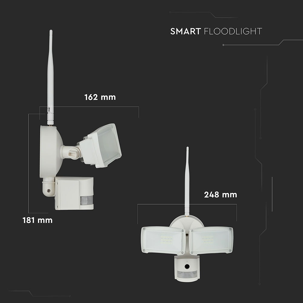SMART LED reflektor WIFI szenzoros kamerával, 18w, 6000K, hideg fehér, 600lm, 180°, fehér, CRI>70, V-TAC, 5745